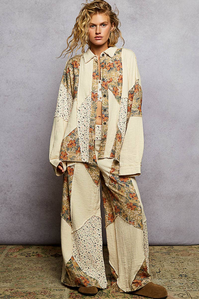 Designed in roomy fit bottom in double gauze with varied printed woven patchwork.