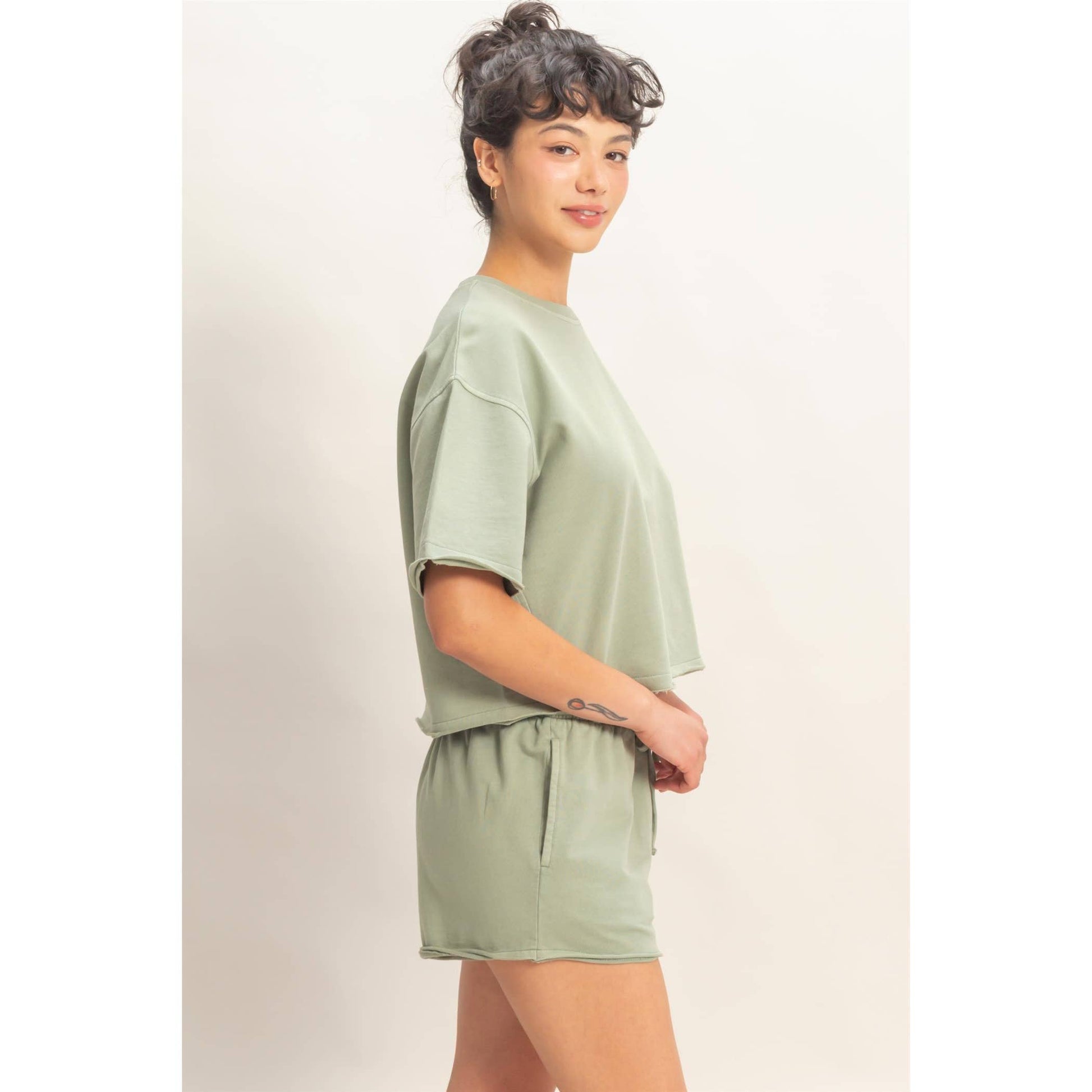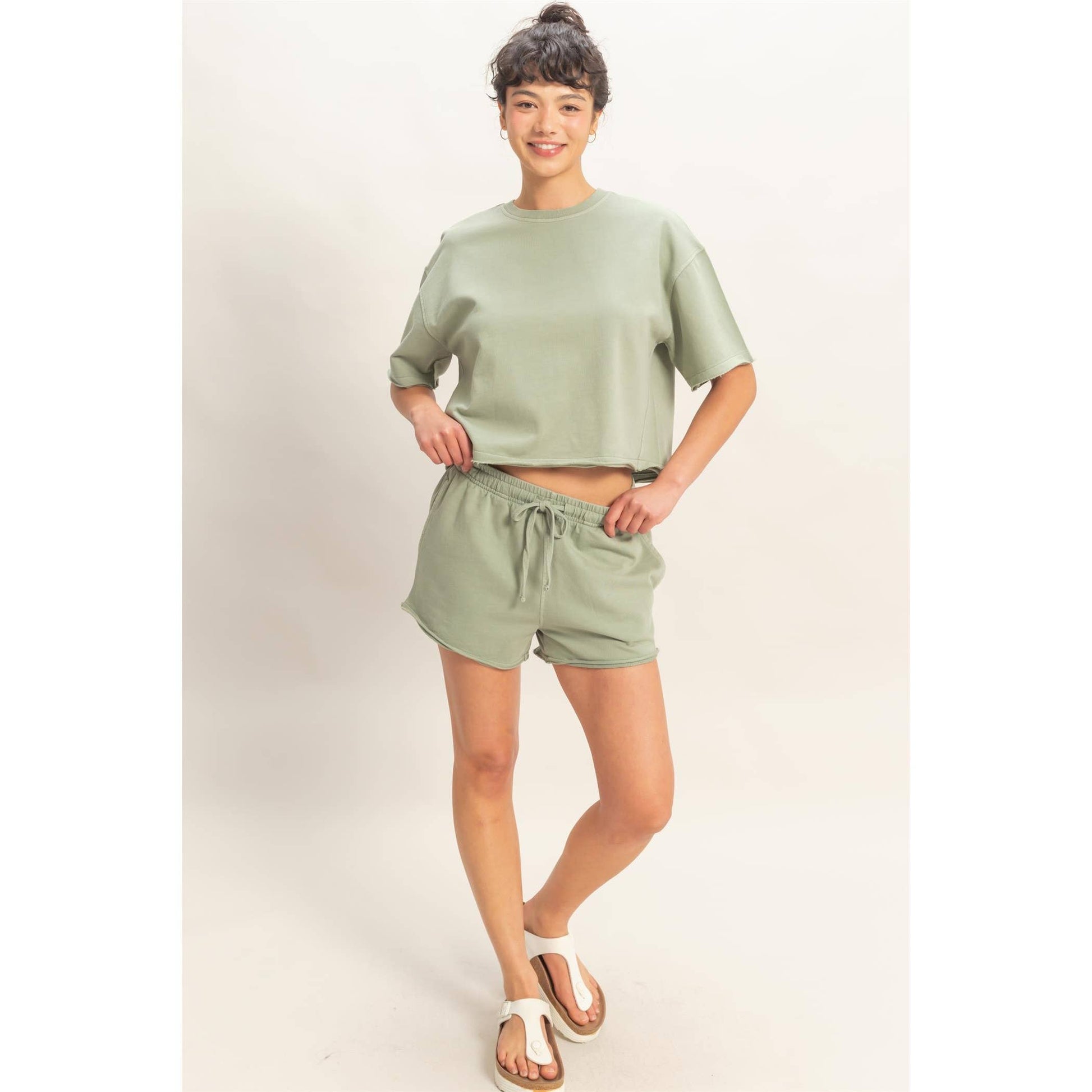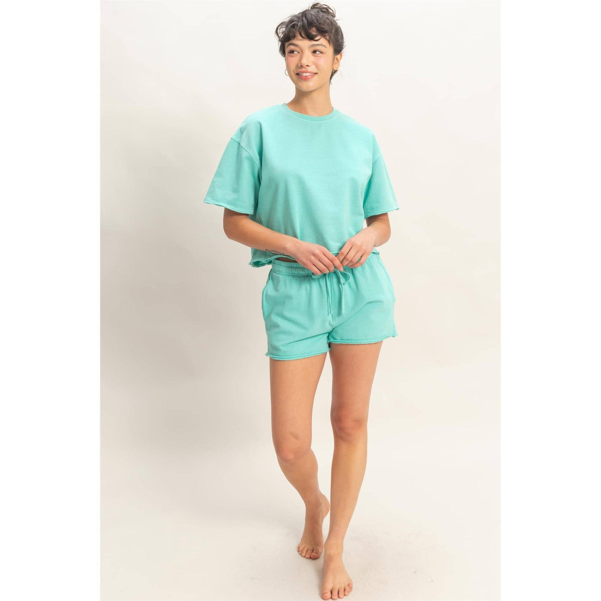 Elevate your leisure with this pigment-dyed lounge set, featuring a stone wash finish. The top features a crew neckline and drop shoulders. All hems are finished with a raw cut and rolled edges. The shorts highlight an elastic waistband with a drawstring and side pockets. Cut in a relaxed fit, style with sneakers for a laid-back look. Model Is 5' 7" Tall, 32" Chest, 25" Waist, 36" Hips And Wearing A Size Small Imported. Designed In The USA