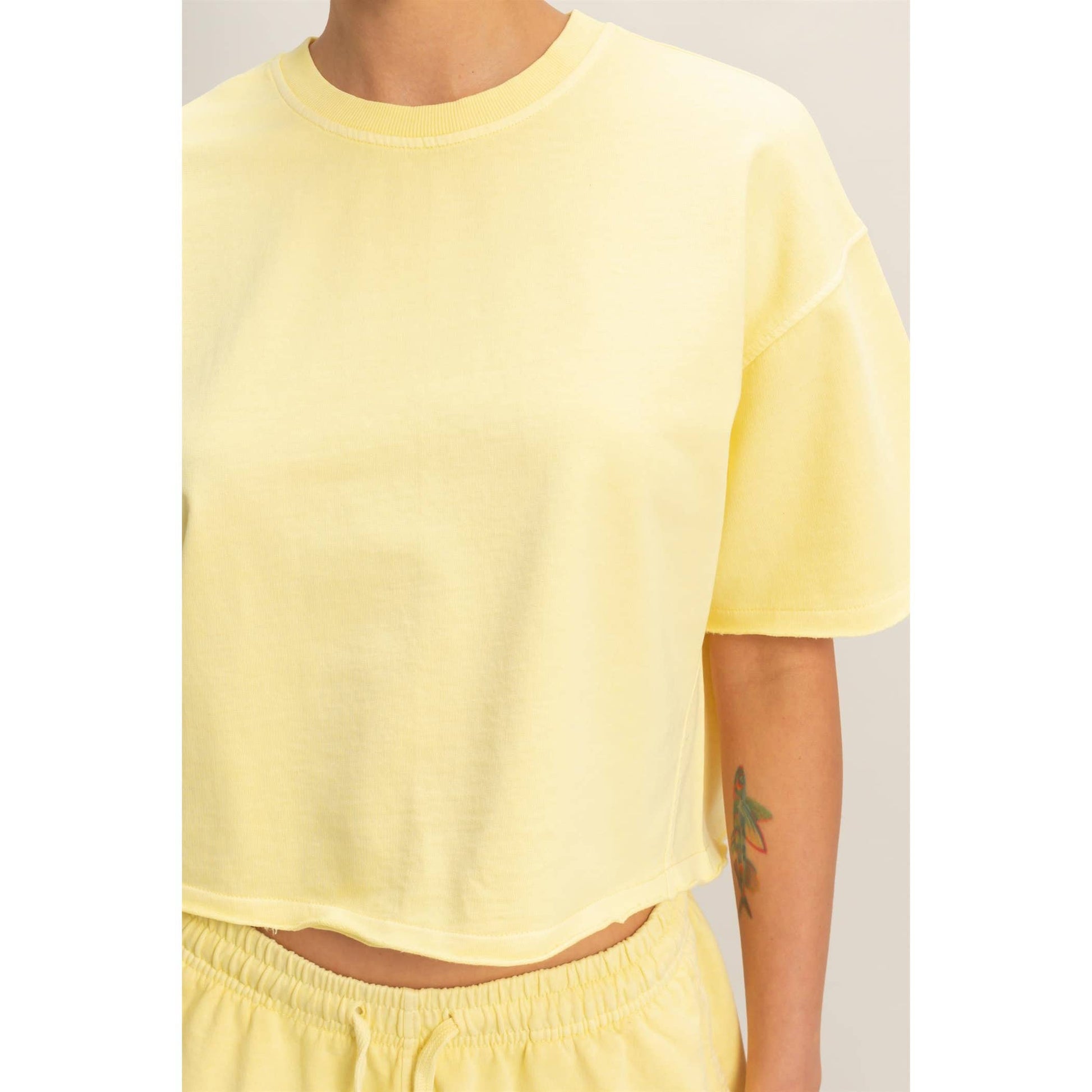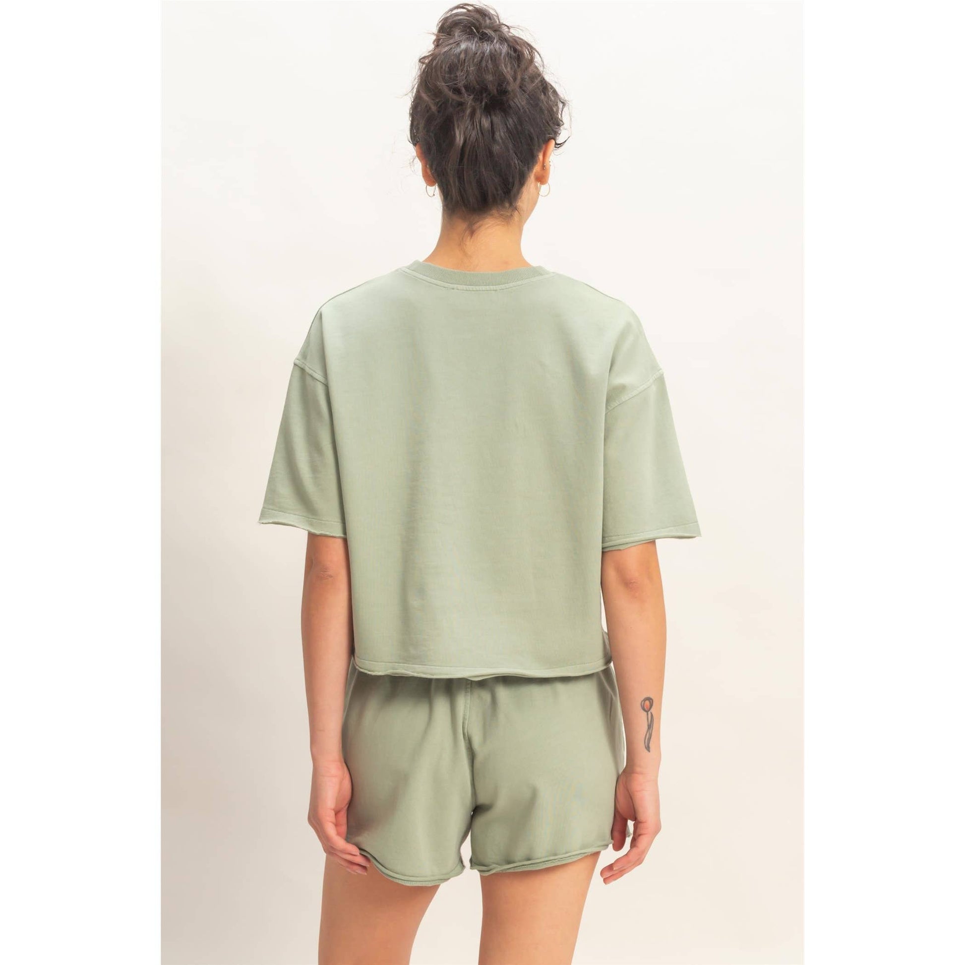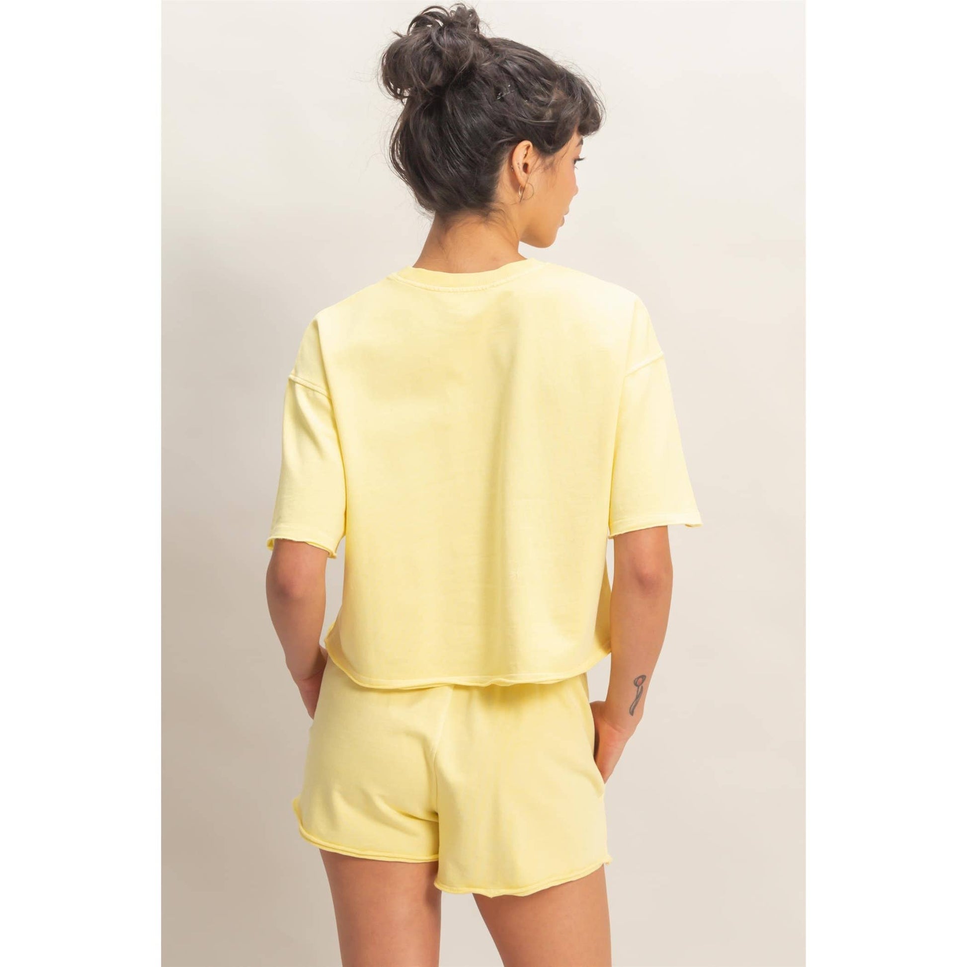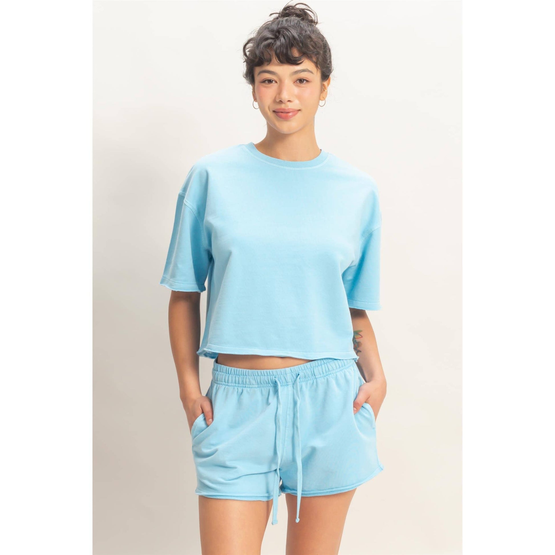Elevate your leisure with this pigment-dyed lounge set, featuring a stone wash finish. The top features a crew neckline and drop shoulders. All hems are finished with a raw cut and rolled edges. The shorts highlight an elastic waistband with a drawstring and side pockets. Cut in a relaxed fit, style with sneakers for a laid-back look. Model Is 5' 7" Tall, 32" Chest, 25" Waist, 36" Hips And Wearing A Size Small Imported. Designed In The USA