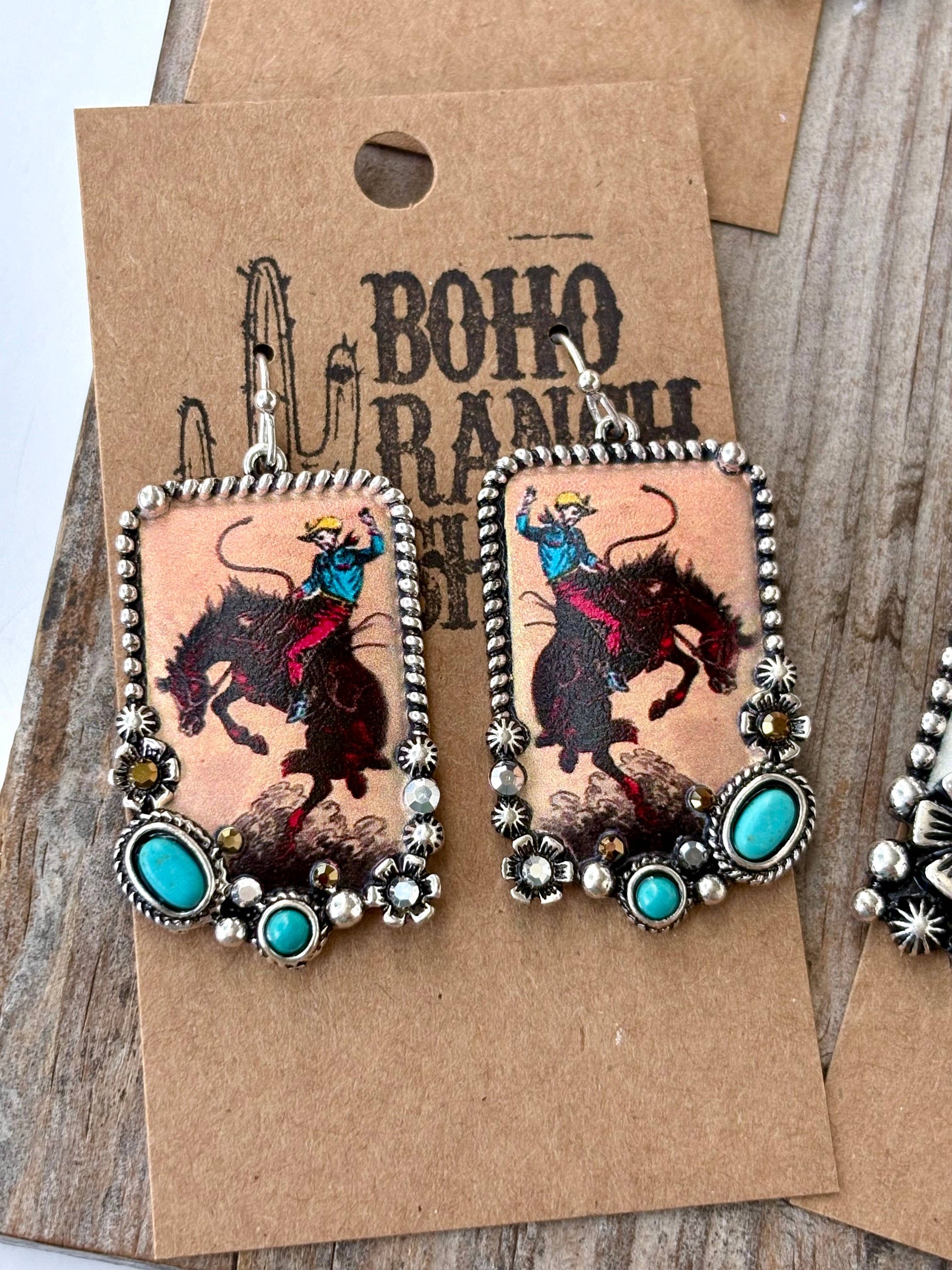 Western Style Printed Pendant with Turquoise Stone Drop Dangle Earrings