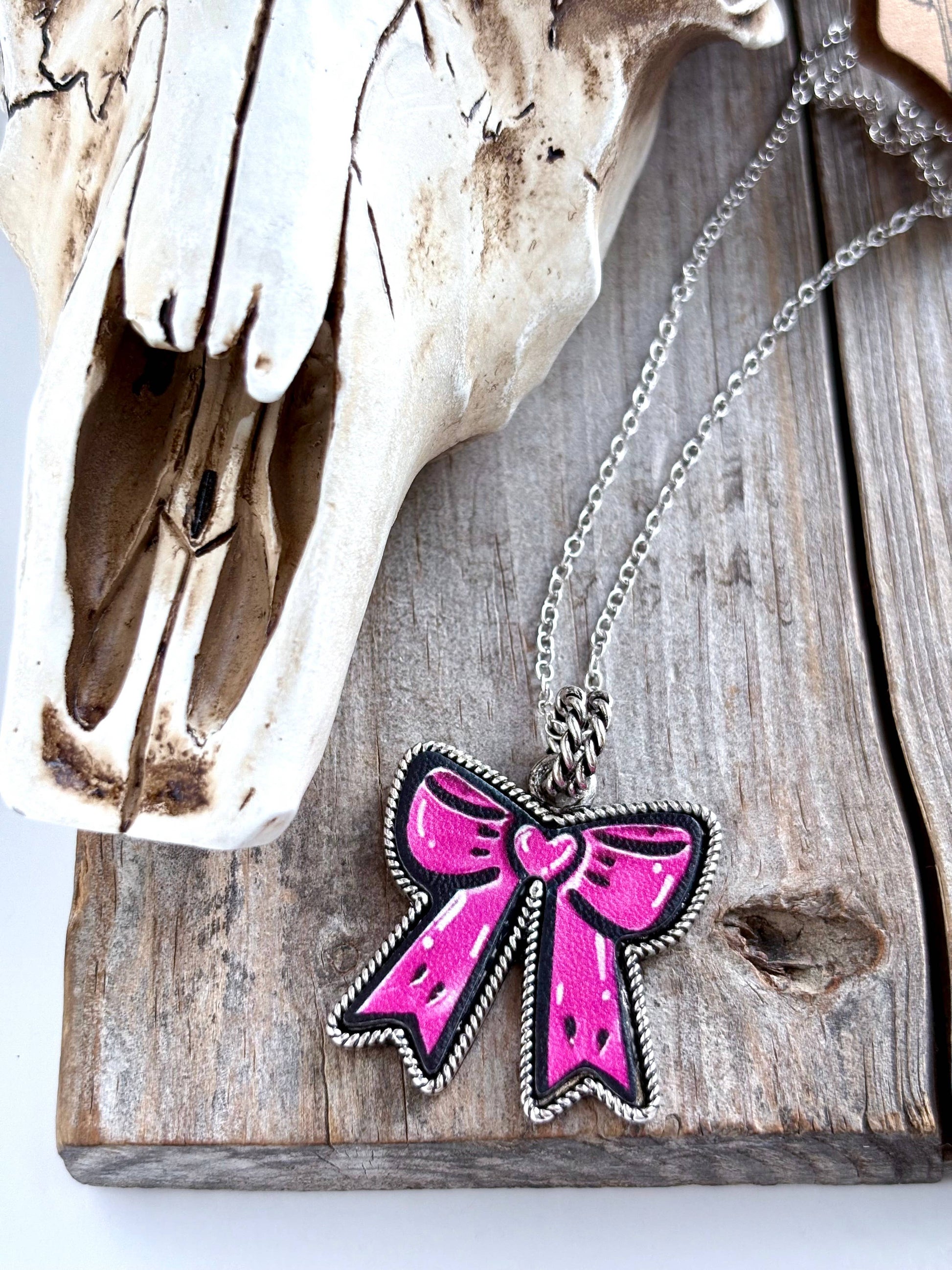 Western Style Theme Playing Card, Bow, & Lighter Printed Leather Pendant Link Chain Necklace